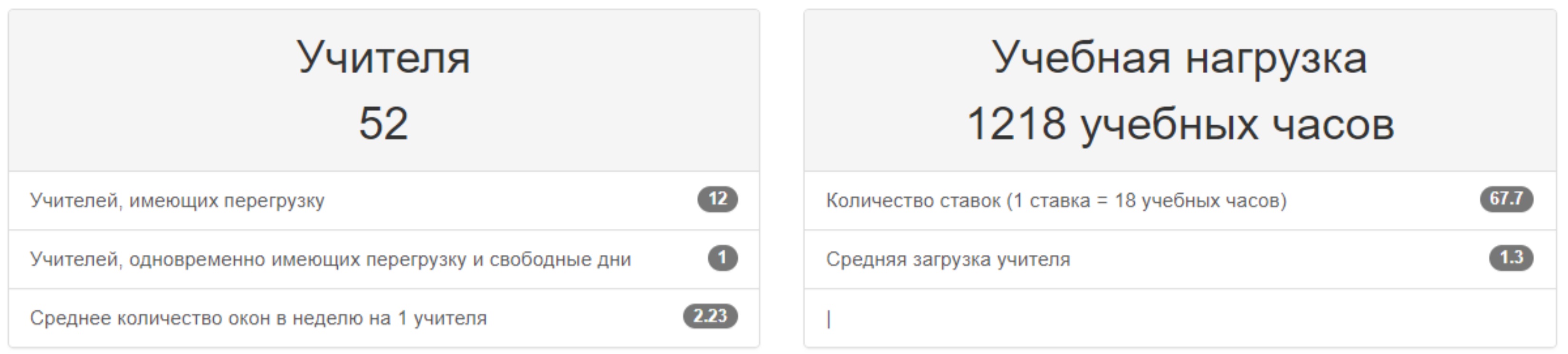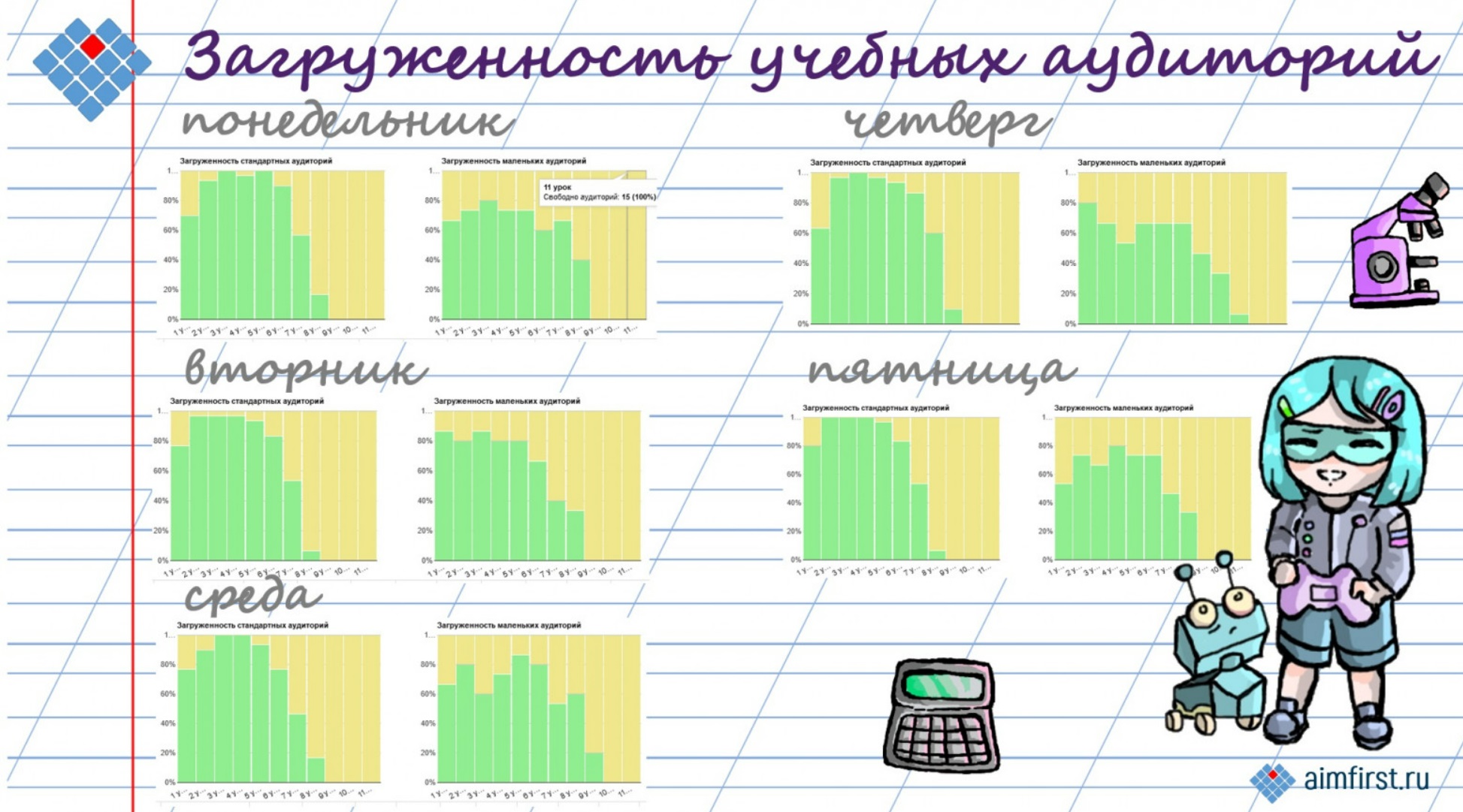 В заголовке этого дашборда выводятся сведения об общем количестве больших помещений (которые могут вмещать более одного класса), стандартных (на один класс) и маленьких (вмещают полкласса – как правило, лингафонные кабинеты и аудитории для занятий информатикой).