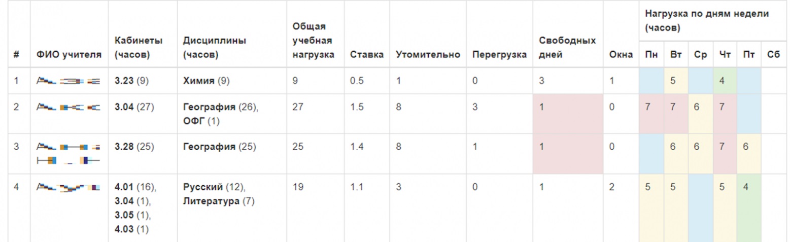 В рамках описания данной таблицы я отмечу наиболее, на мой взгляд, существенные аспекты – прежде всего назначение цветов. Голубым отмечены дни, когда у учителя нет занятий. Зеленым – если количество занятий не превышает четырех, желтым – от пяти до шести уроков. Если занятий в день больше шести – ячейка отображается розовым (перегрузка). Как я уже отмечал, на мой взгляд, преподавание в режиме «перегрузка» заведомо неэффективно и реально небезопасно для детей. Поэтому я считаю недопустимым предоставление методических дней учителям, работающим более чем на одну ставку. При этом, если у учителя при наличии перегрузки в течение недели есть свободные от уроков дни, то ячейка, отражающая количество свободных дней, тоже подсвечивается розовым.
