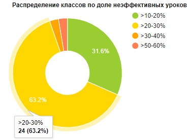 Распределение классов по доле неэффективных уроковпомогает оценить количество классов относительно доли неэффективных уроков в учебном процессе. Например, на рисунке показано, что при составленном расписании для 24 классов (почти 63,2% от общего числа классов в школе) доля неэффективных уроков в учебном процессе составляет от 20 до 30%.