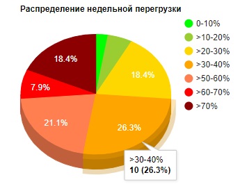 Распределение недельной перегрузкипомогает оценить количество классов относительно доли суммарной недельной перегрузки (сумма баллов, превышающих усредненное количество баллов трудности предметов). Например, на рисунке показано, что при составленном расписании для 10 классов (26,3% от общего числа классов в школе) суммарное превышение баллов трудности по отдельным дням составляет от 30 до 40% от общего количества баллов трудности по учебной программе этих классов. Данный показатель характеризует равномерность распределения трудных предметов в течение недели. Чем больше дней, в которых проводится много уроков по трудным предметам, тем будет больше перекос распределения.