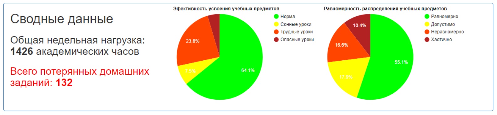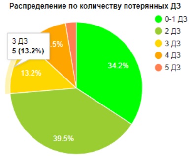 Распределение по количеству потерянных домашних заданийпомогает оценить количество классов по сумме потерянных домашних заданий (за счет сдваивания и утраивания уроков). При этом удвоение уроков по предметам «Технология» и «Физкультура» из этого подсчета исключены. Показатель характеризует равномерность распределения дисциплин по одному предмету в течение учебной недели.