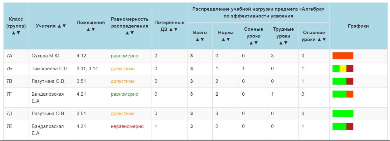 На вкладке «Классы»отображаются результаты влияния составленного расписания занятий на отдельные классы.