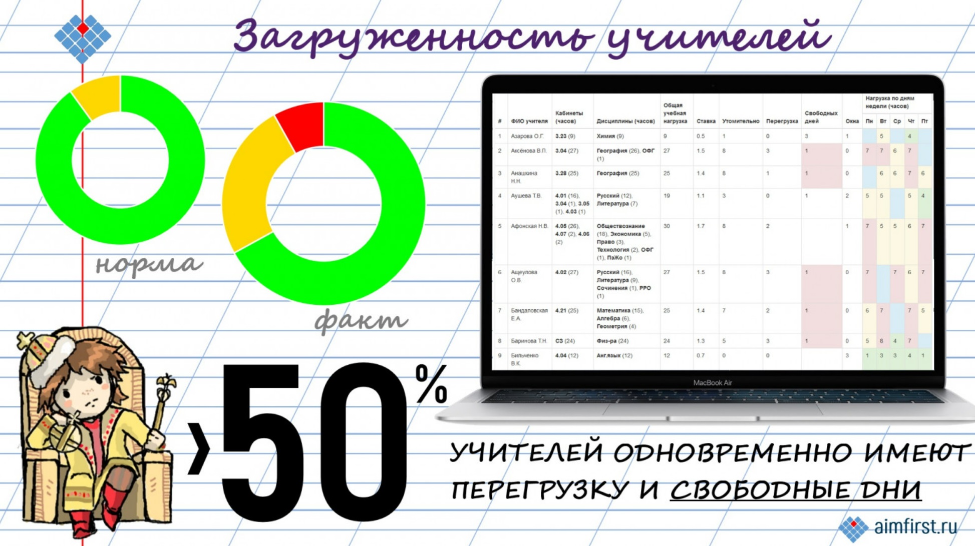 Я предполагаю, что в этом случае найти взаимопонимание будет значительно проще. Только давить не надо. Директора школ тоже бывают разные. И у них, поверьте, проблем в нынешних условиях и так выше крыши... Однако отмечу, что доброе слово, подкрепленное объективным анализом расписания уроков на сайте aimfirst.ruдействует гораздо убедительнее, чем просто доброе слово...